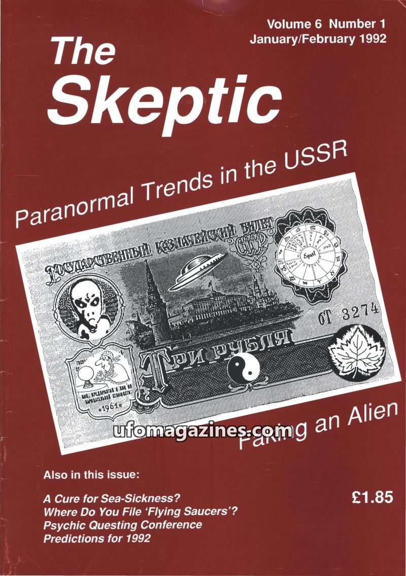 This issue of The Skeptic, January/February 1992, delves into 'Paranormal Trends in the USSR' with cover imagery featuring UFOs and alien motifs on a Soviet banknote. Articles exam