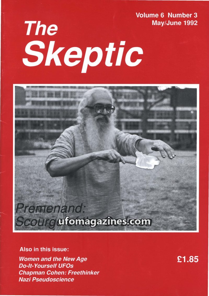 This issue of The Skeptic, dated May/June 1992, critically examines various phenomena and claims. A central article profiles Premanand, an individual dedicated to exposing the dece