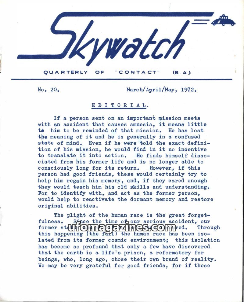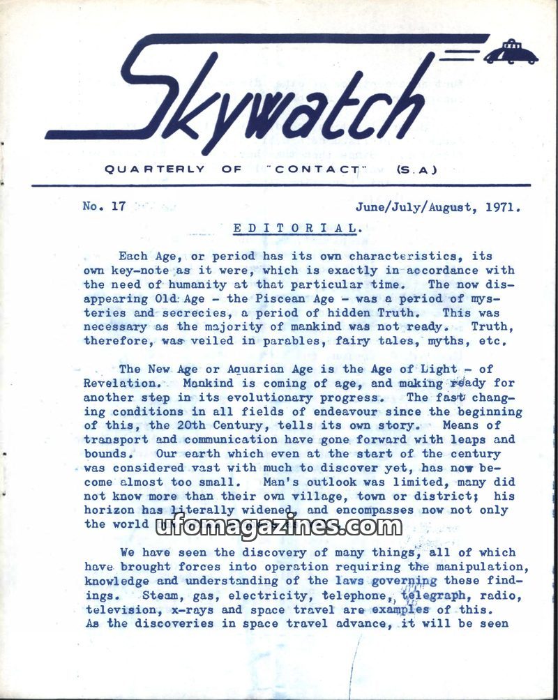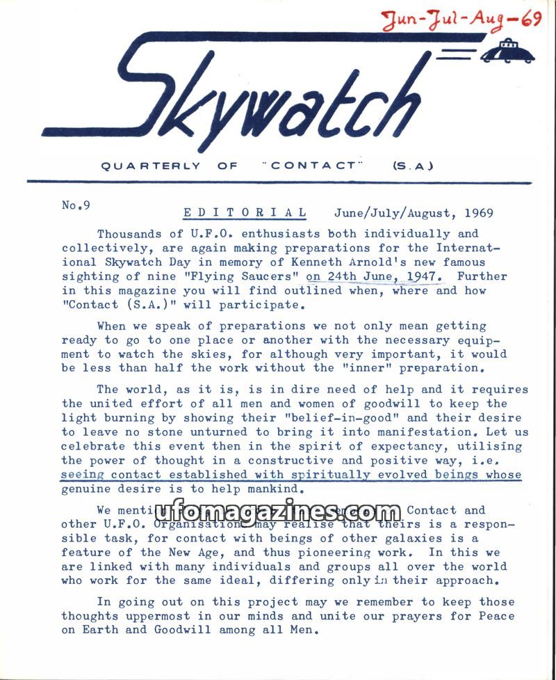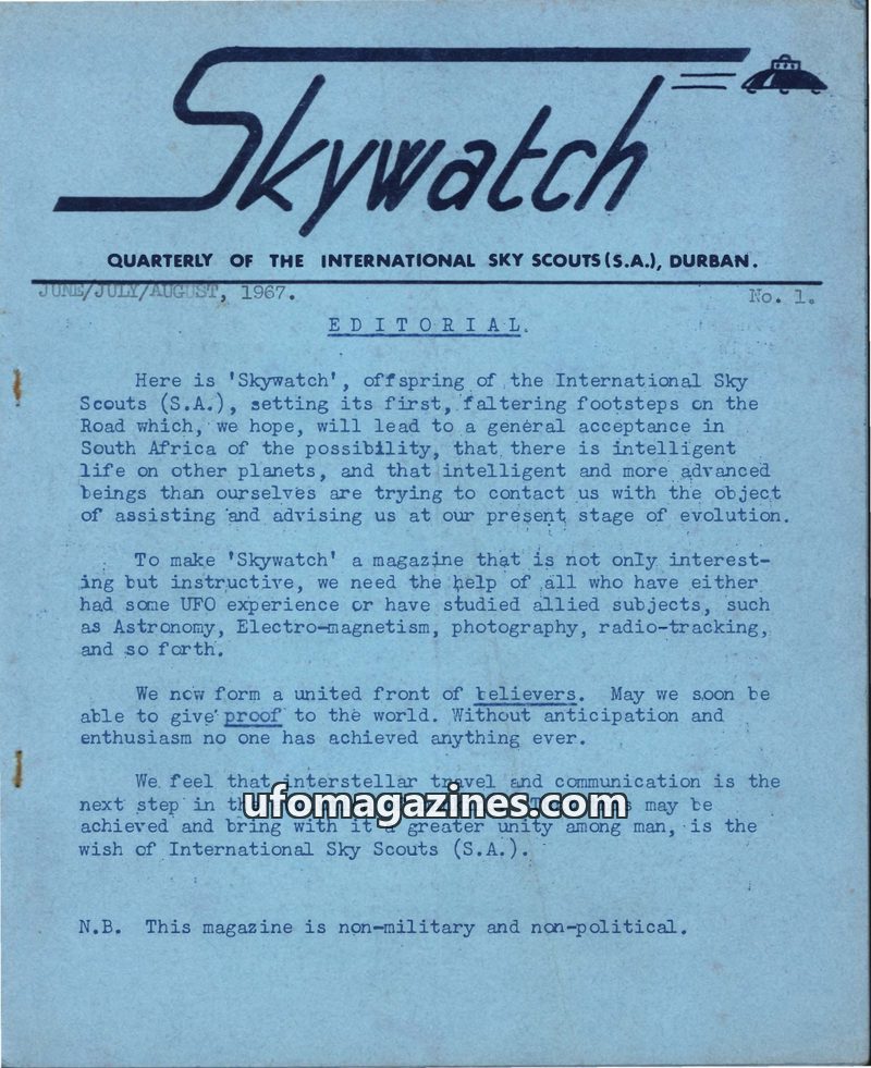 The first issue of 'Skywatch' magazine, published by the International Sky Scouts (S.A.) in June/July/August 1967, aims to promote the acceptance of intelligent extraterrestrial li