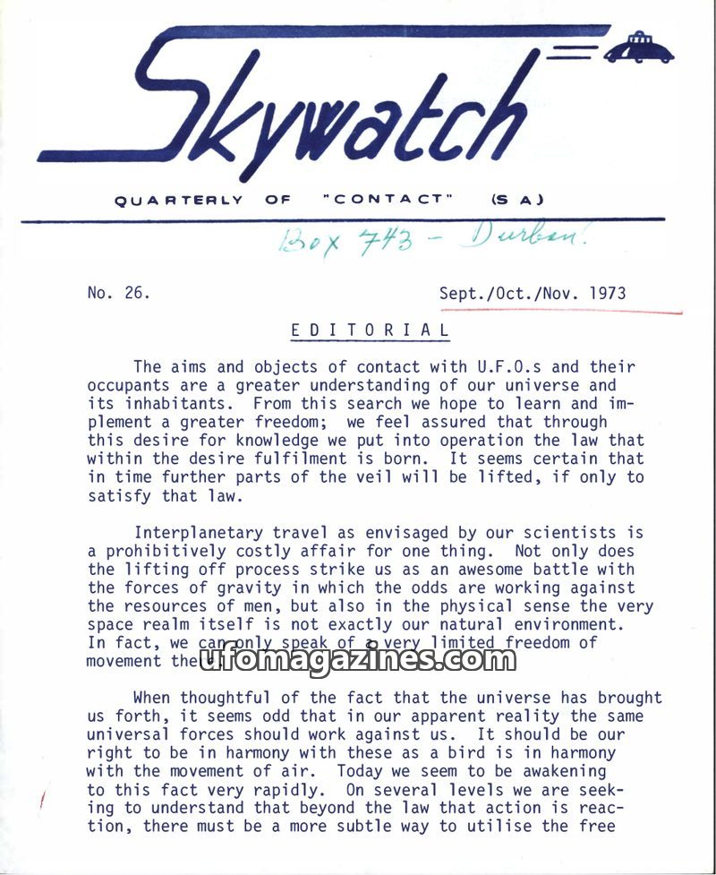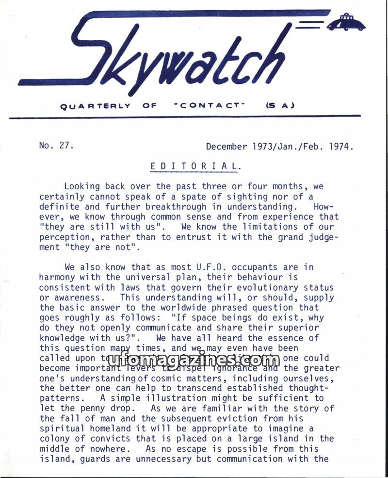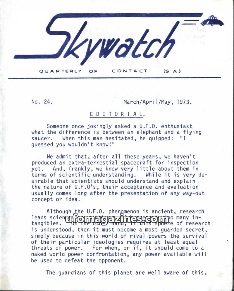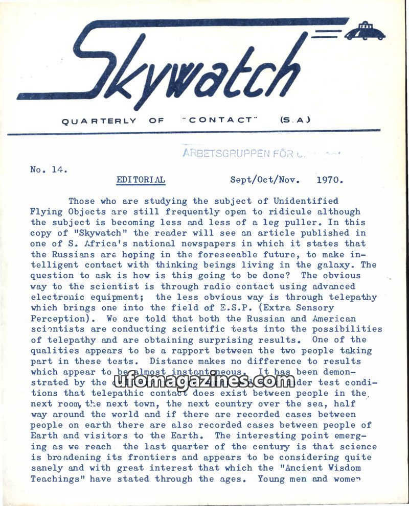 The first issue of 'Skywatch' magazine, published by the International Sky Scouts (S.A.) in June/July/August 1967, aims to promote the acceptance of intelligent extraterrestrial li