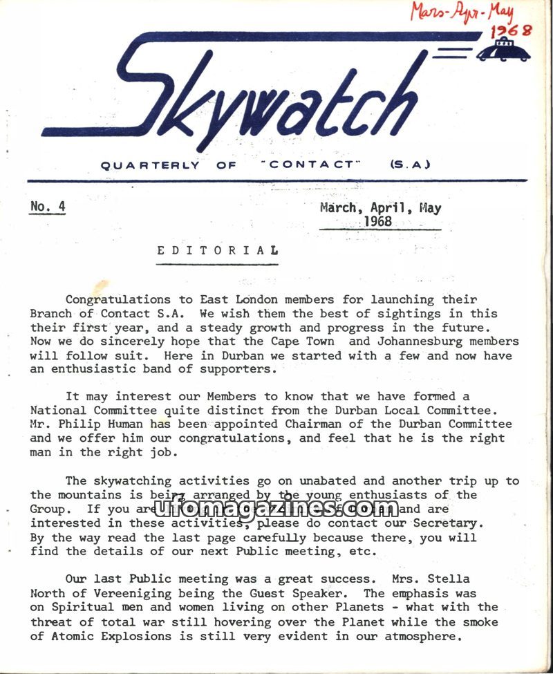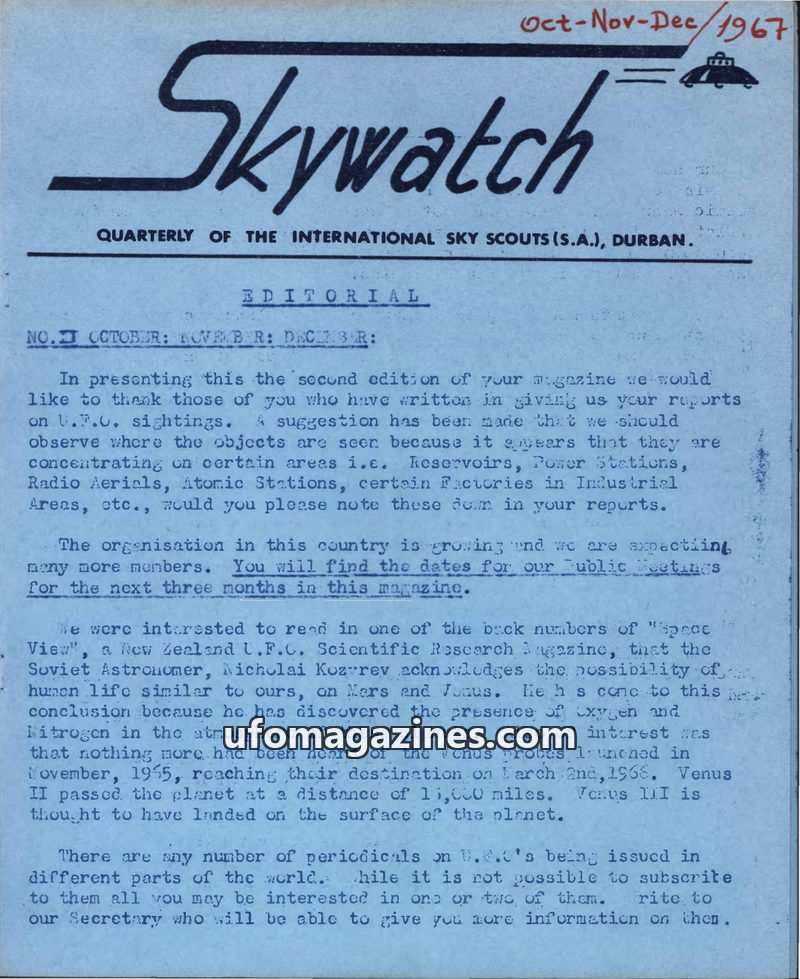 This issue of Skywatch magazine, dated Oct-Nov-Dec 1967, focuses on UFO sightings reported by International Sky Scouts members in South Africa. The editorial encourages detailed re