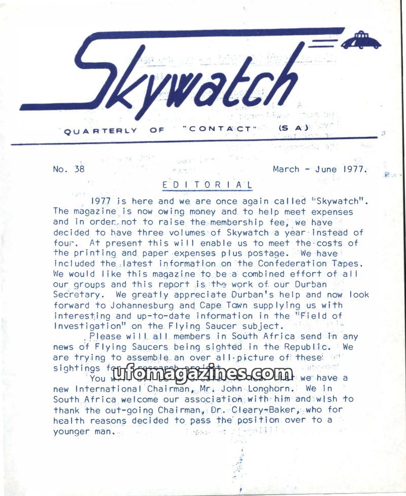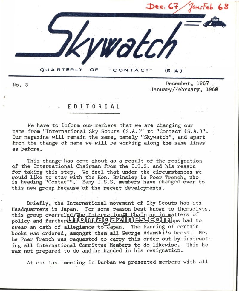This issue announces the name change of the 'International Sky Scouts (S.A.)' to 'Contact (S.A.)' due to a dispute with the International Chairman. It details two significant UFO s