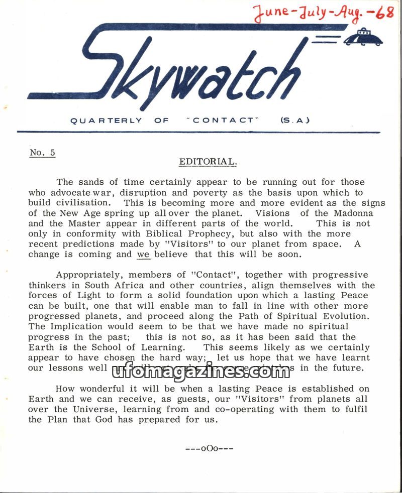 This issue of Skywatch, dated June-July-August 1968, features an editorial discussing the signs of a New Age and the potential for lasting peace through spiritual evolution and con