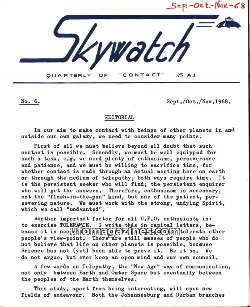 This issue of Skywatch, dated Sep-Oct-Nov 1968, focuses on the pursuit of contact with extraterrestrial beings, emphasizing enthusiasm, perseverance, and tolerance among UFO enthus