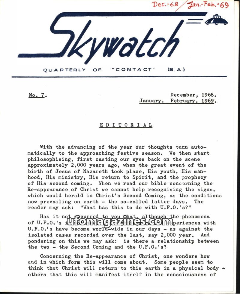This issue of Skywatch magazine, dated December 1968-February 1969, features an editorial exploring the potential relationship between UFO phenomena and the Second Coming of Christ
