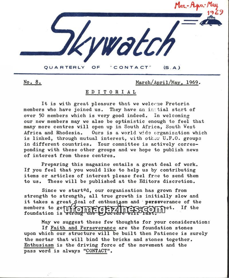This issue of Skywatch, dated March/April/May 1969, features an editorial welcoming new members and emphasizing the importance of faith, perseverance, patience, and enthusiasm for