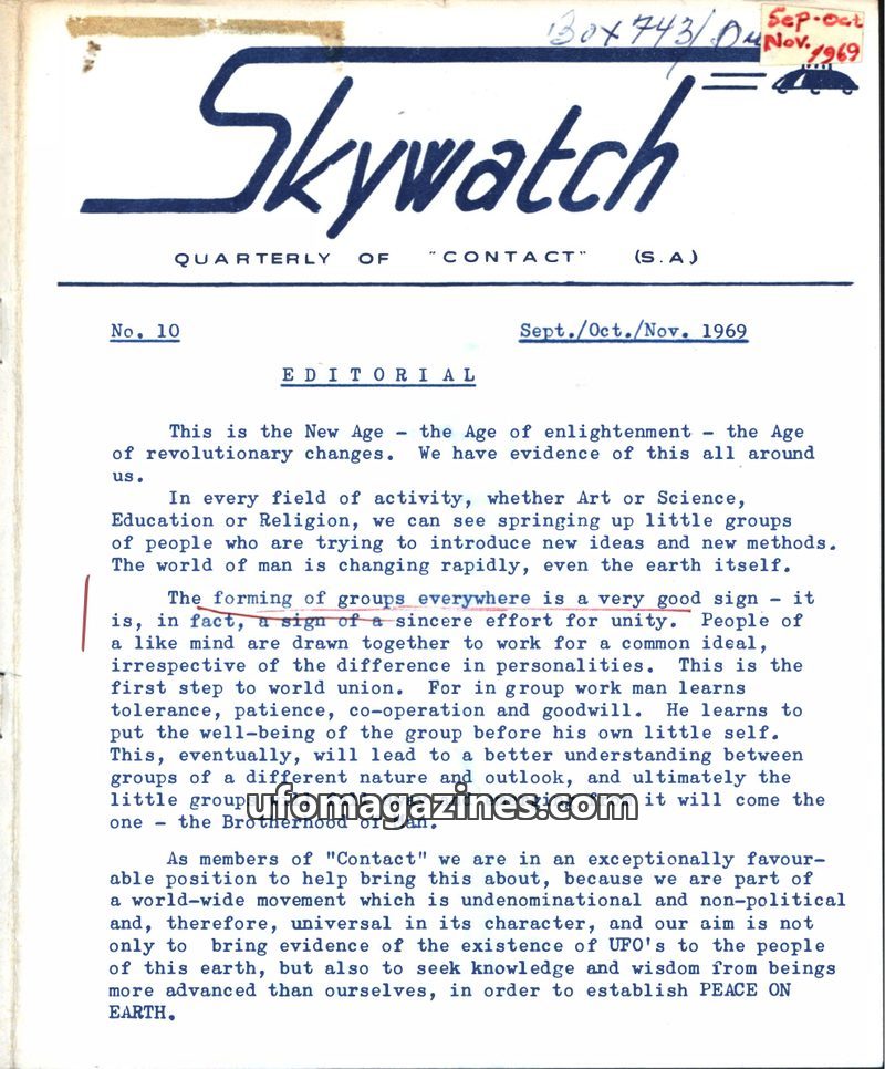 This issue of Skywatch, dated Sept./Oct./Nov. 1969, features an editorial discussing the rise of 'New Age' groups and the potential for world unity through shared ideals, with 'Con