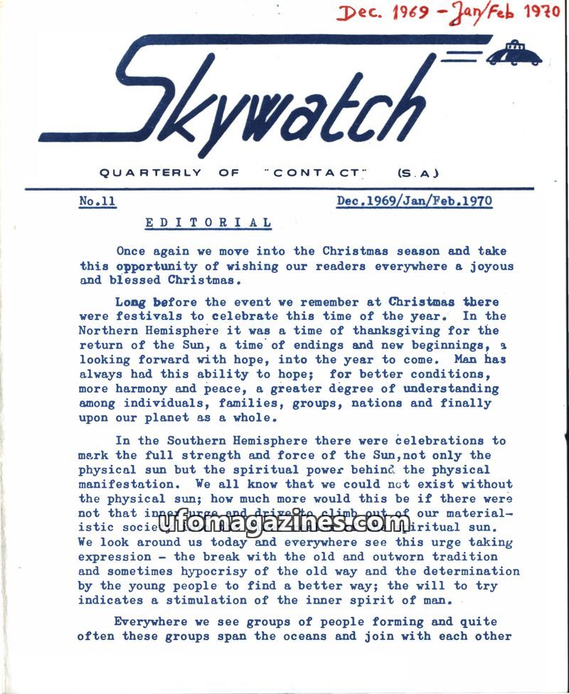 This issue of Skywatch magazine, dated December 1969-January/February 1970, includes an editorial reflecting on Christmas, unity, and the spiritual evolution of humanity. It featur