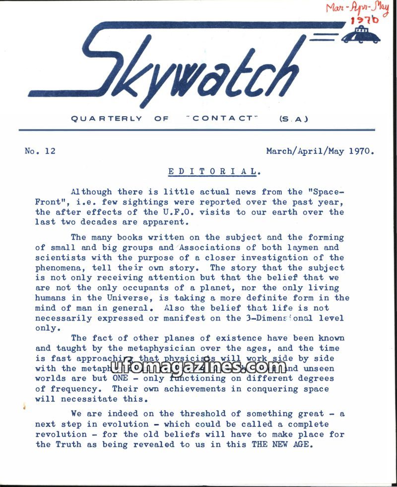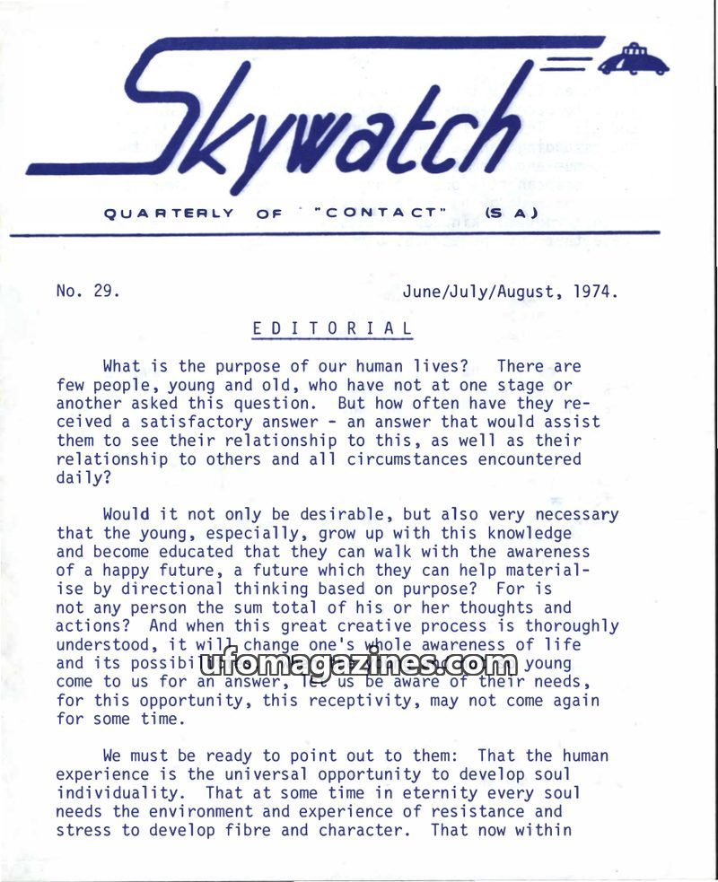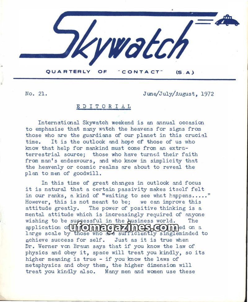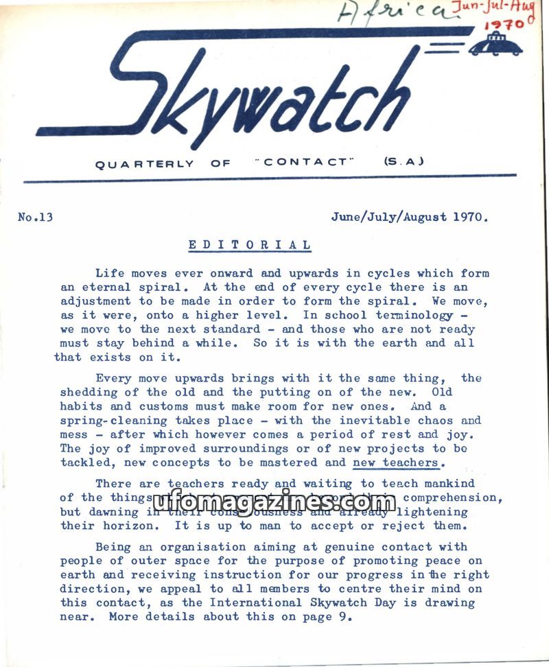 This issue of Skywatch magazine, dated June/July/August 1970, features an editorial discussing life's cycles and the importance of contact with outer space for peace and progress.
