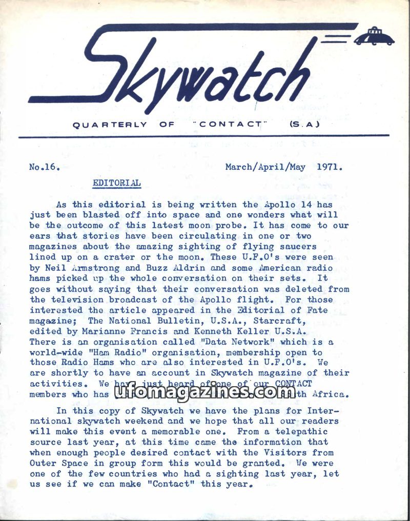This issue of Skywatch magazine, dated March/April/May 1971, features an editorial discussing UFO sightings related to the Apollo 14 moon mission and the 'Data Network' organizatio