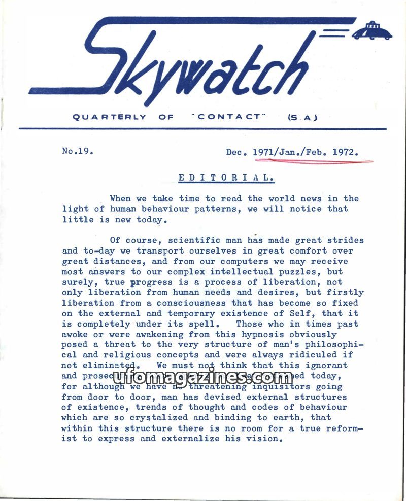 This issue of Skywatch magazine, dated December 1971/January-February 1972, features an editorial discussing human behavior, scientific progress, and spiritual liberation. It inclu