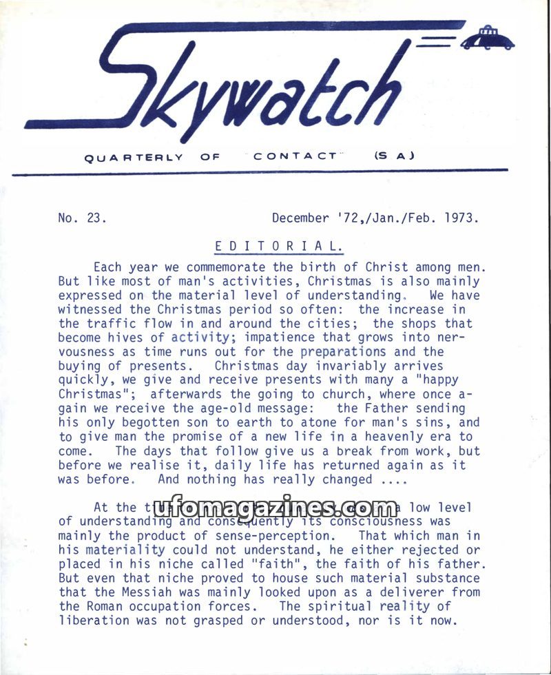 This issue of Skywatch delves into the nature of Christmas and its spiritual versus material interpretations. It discusses the possibility of extraterrestrial civilizations, refere