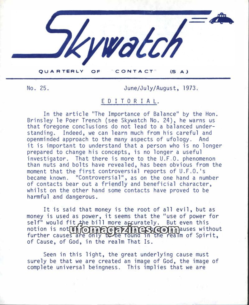 This issue of Skywatch features an editorial by Brinsley le Poer Trench discussing the importance of an open mind in ufology and the dual nature of UFO contacts. It highlights the