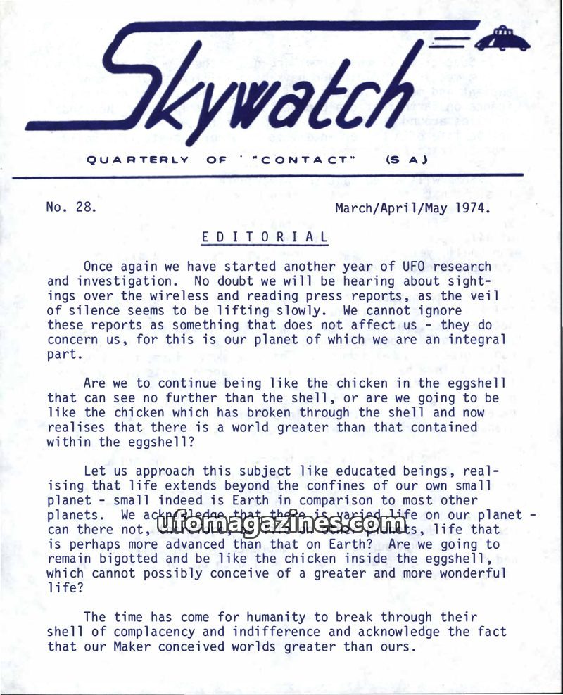 This issue of Skywatch Quarterly (No. 28, March/April/May 1974) features an editorial urging humanity to break through complacency and acknowledge the possibility of advanced extra