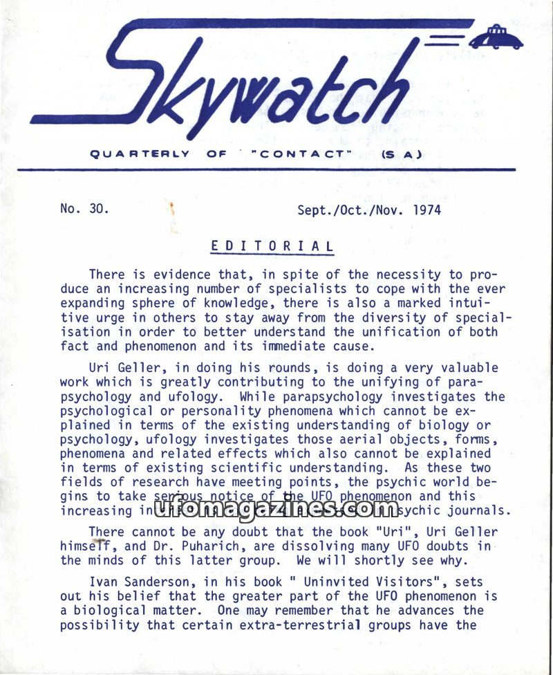 This issue of Skywatch magazine from September/October/November 1974 features an editorial discussing the convergence of parapsychology and ufology, highlighting Uri Geller's work