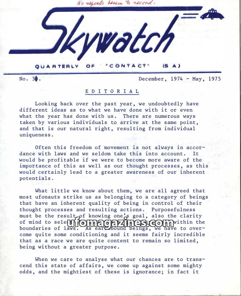 This issue of Skywatch magazine, dated December 1974 to May 1975, features an editorial reflecting on the past year and the potential for human self-awareness and re-orientation, p