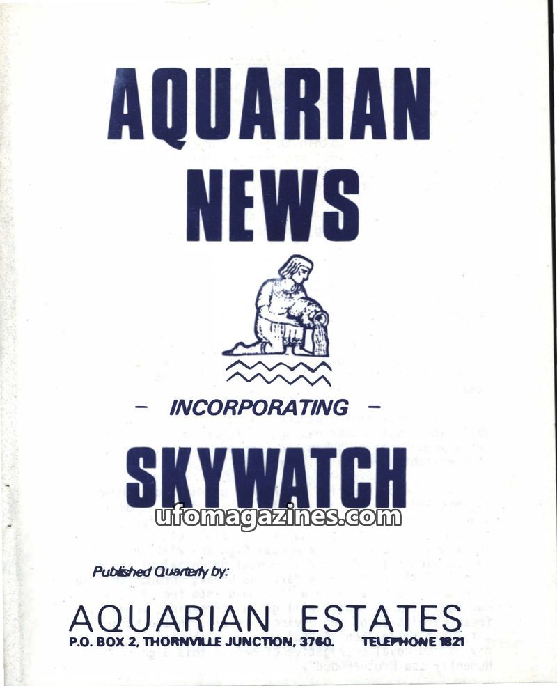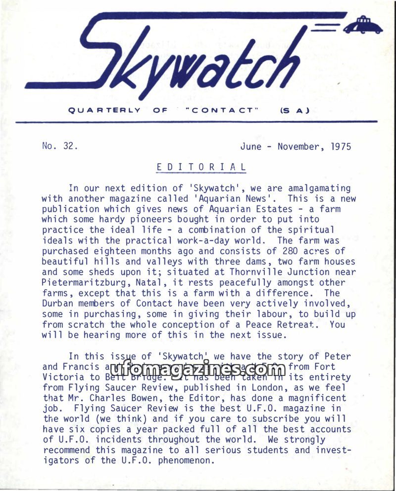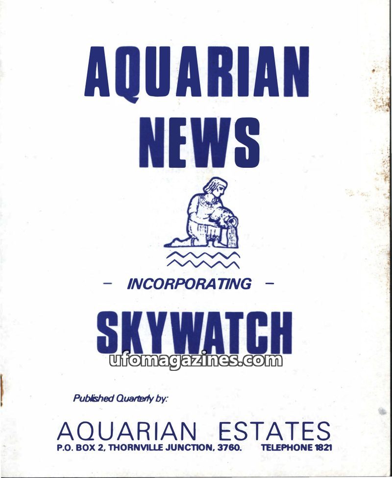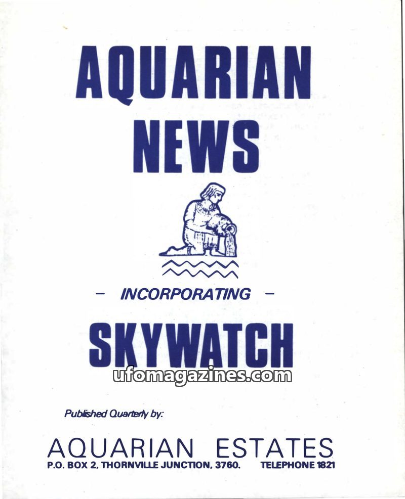 This issue of 'Skywatch' announces its amalgamation with 'Aquarian News' to feature 'Aquarian Estates', a spiritual farm project. It highlights an article detailing Peter and Franc