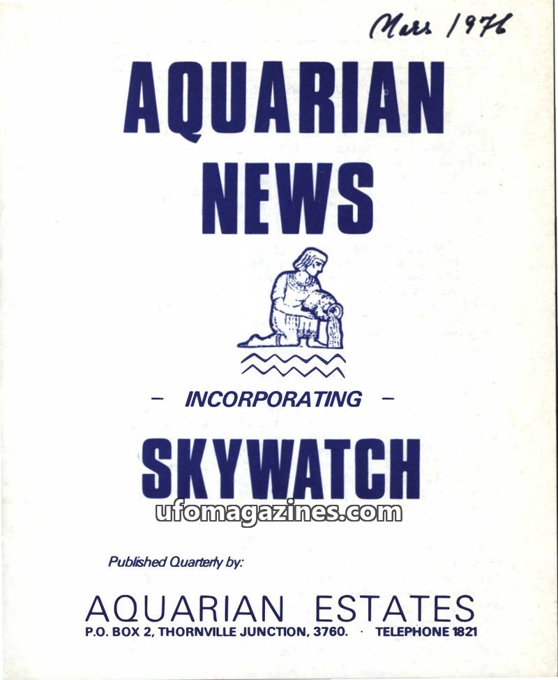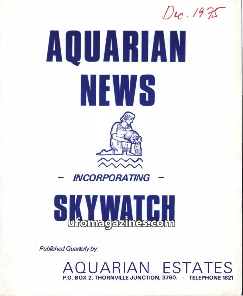This issue of Aquarian News, dated December 1975, is the first edition and incorporates Skywatch. It details the aims and objects of Aquarian Estates, a farm and community centre i
