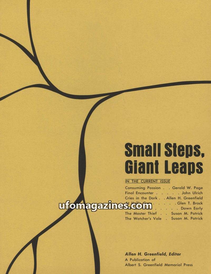 AI-generated English summaries and cover images of Small Steps Giant Leaps (Allen Greenfield) from the Archives for the Unexplained (AFU) in Norrköping, Sweden. Each entry summarises the complete contents of an issue — articles, sighting reports, interviews, key people, locations, and dates.