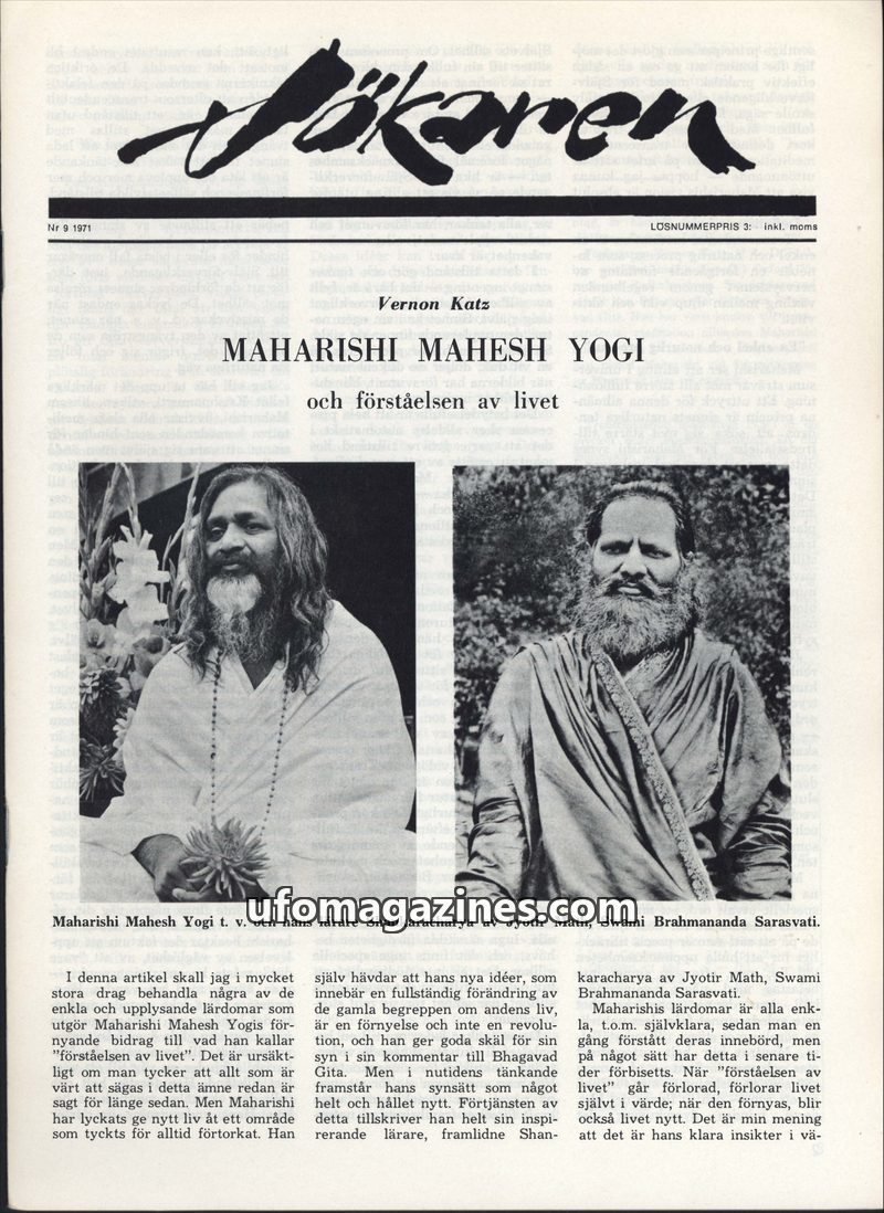 This issue of Sökaren magazine from September 1971 features an in-depth article on Maharishi Mahesh Yogi and his teachings on the understanding of life, presented as a renewal of a