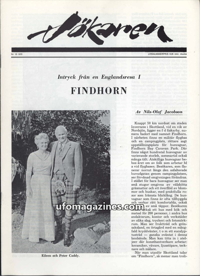 This issue of Jäkaren magazine features two main articles: one on the Findhorn community in Scotland, detailing its origins, philosophy of spiritual living, and communal structure,
