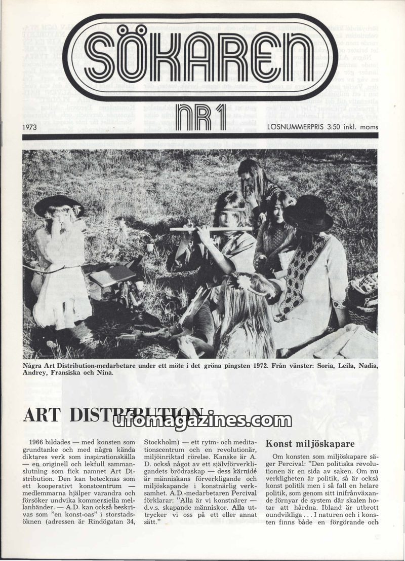 This issue of Sökaren magazine from 1973 delves into various cultural and spiritual topics. It features an in-depth look at 'Art Distribution,' a cooperative art center in Stockhol