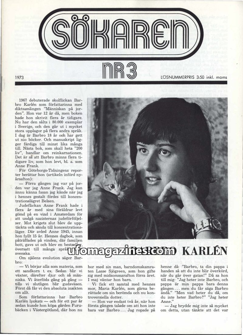 This issue of Sökaren magazine from 1973 delves into the extraordinary claims of Barbro Karlén, a young Swedish author who believes she has lived past lives, most notably as Anne F