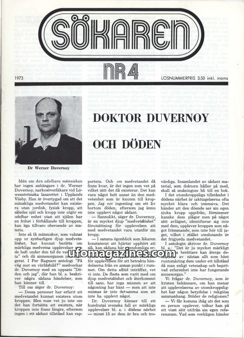 This issue of Sökaren magazine delves into parapsychology and the nature of consciousness. It features an interview with Dr. Werner Duvernoy, who discusses the possibility of consc