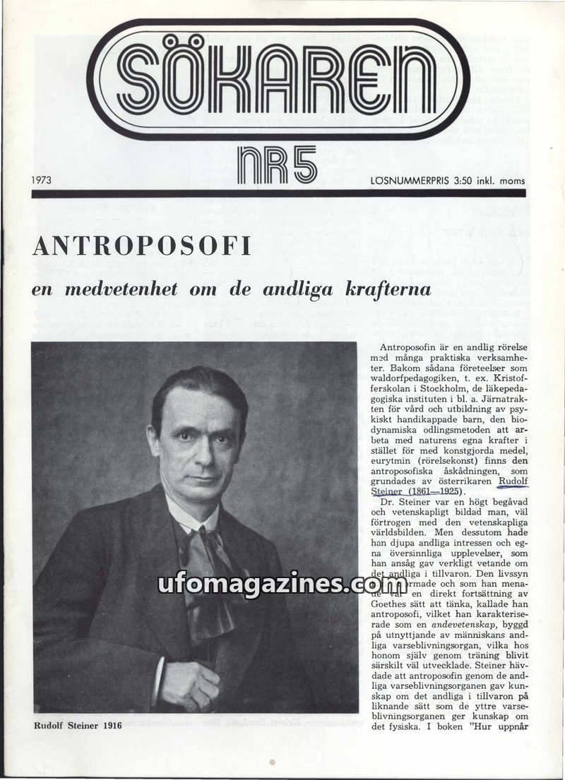 This issue of Sökaren magazine from 1973 delves into Anthroposophy, founded by Rudolf Steiner, exploring its practical applications in education (Waldorf pedagogy), biodynamic farm