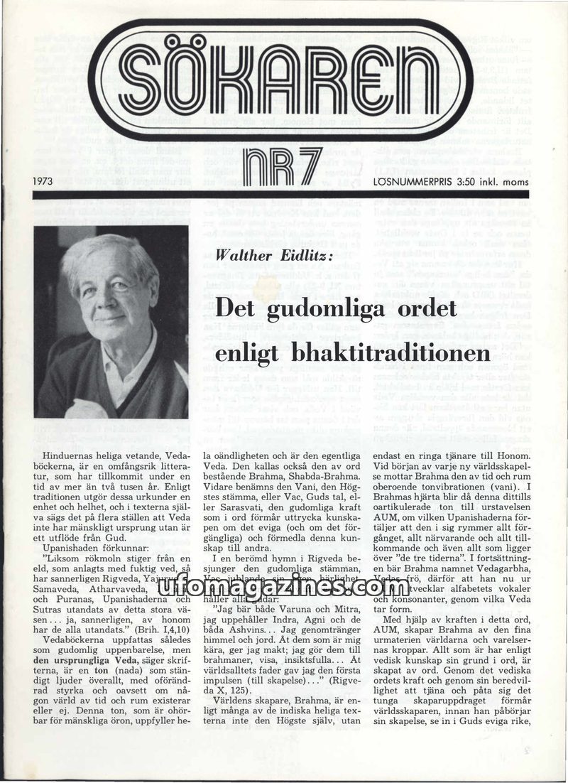 This issue of Sökaren (NR 7, 1973) delves into the concept of the divine word in Bhakti traditions, exploring the Veda and its interpretation. It also features articles on Brahmach