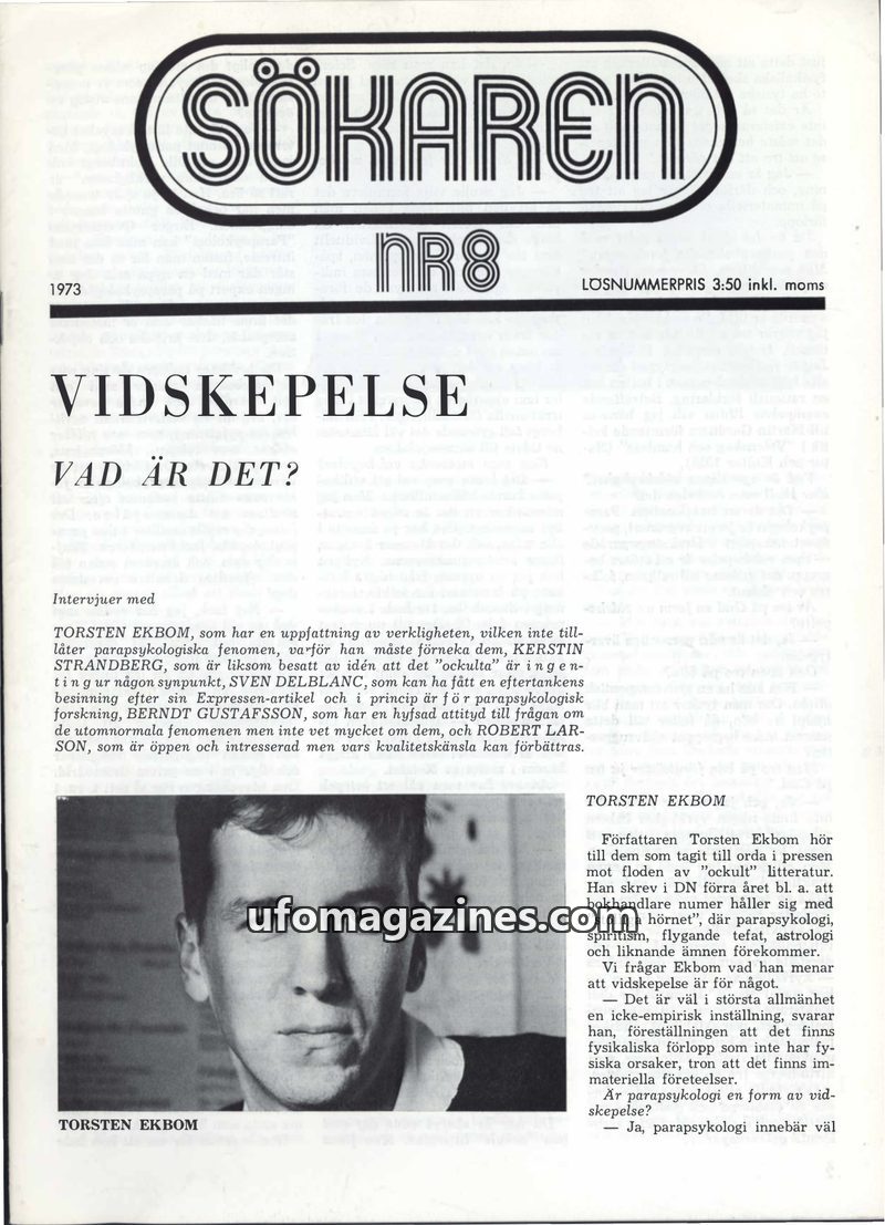 This issue of Sökaren magazine, NR8 from 1973, delves into the concept of superstition, featuring interviews with authors Torsten Ekbom, Kerstin Strandberg, and Sven Delblanc, as w