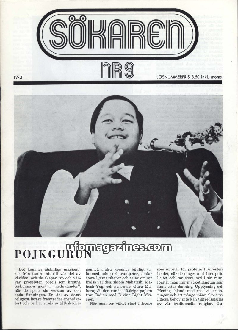 This issue of Sökaren (NR9, 1973) delves into various spiritual and philosophical topics. It features an article on Guru Maharaj Ji, a 15-year-old Indian spiritual leader, and the