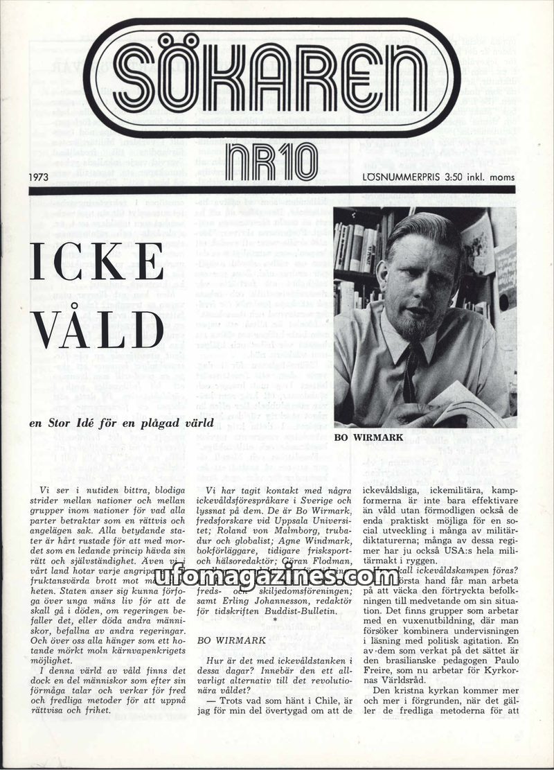 This issue of Sökaren magazine delves into the concept of nonviolence as a viable alternative to armed conflict, featuring interviews with Swedish peace advocates like Bo Wirmark a