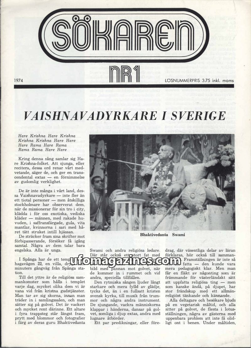 This issue of Sökaren magazine from 1974 delves into various spiritual and esoteric topics. It features an in-depth look at Vaishnava devotees, particularly the Hare Krishna moveme