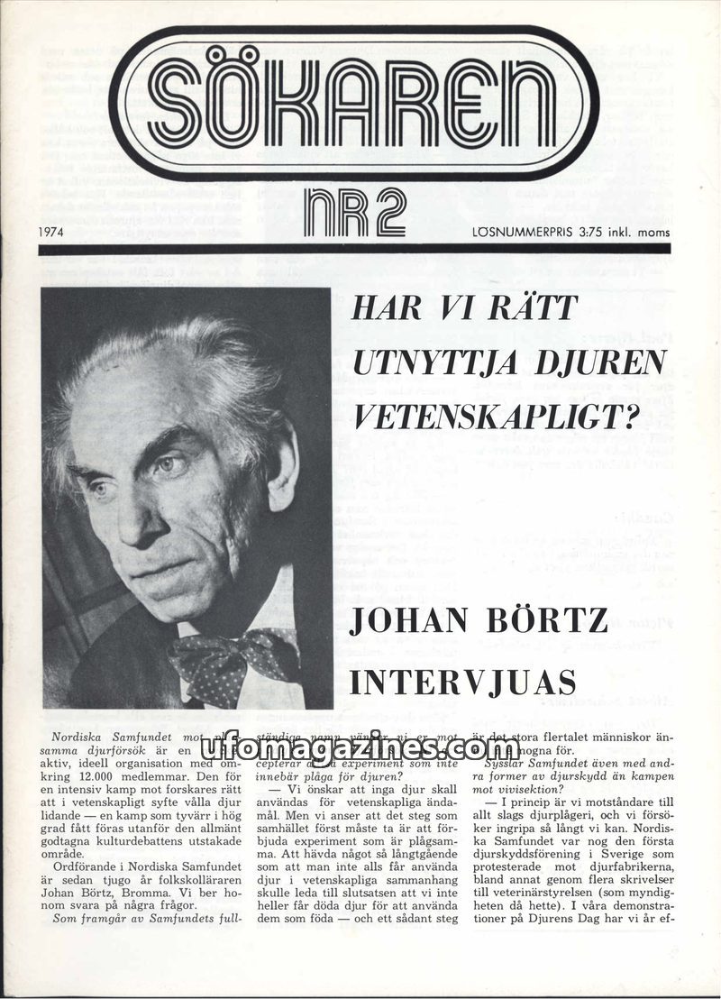 This issue of Sökaren features an interview with Johan Börtz, chairman of the Nordic Society Against Cruel Animal Experiments, who advocates for animal rights and against vivisecti