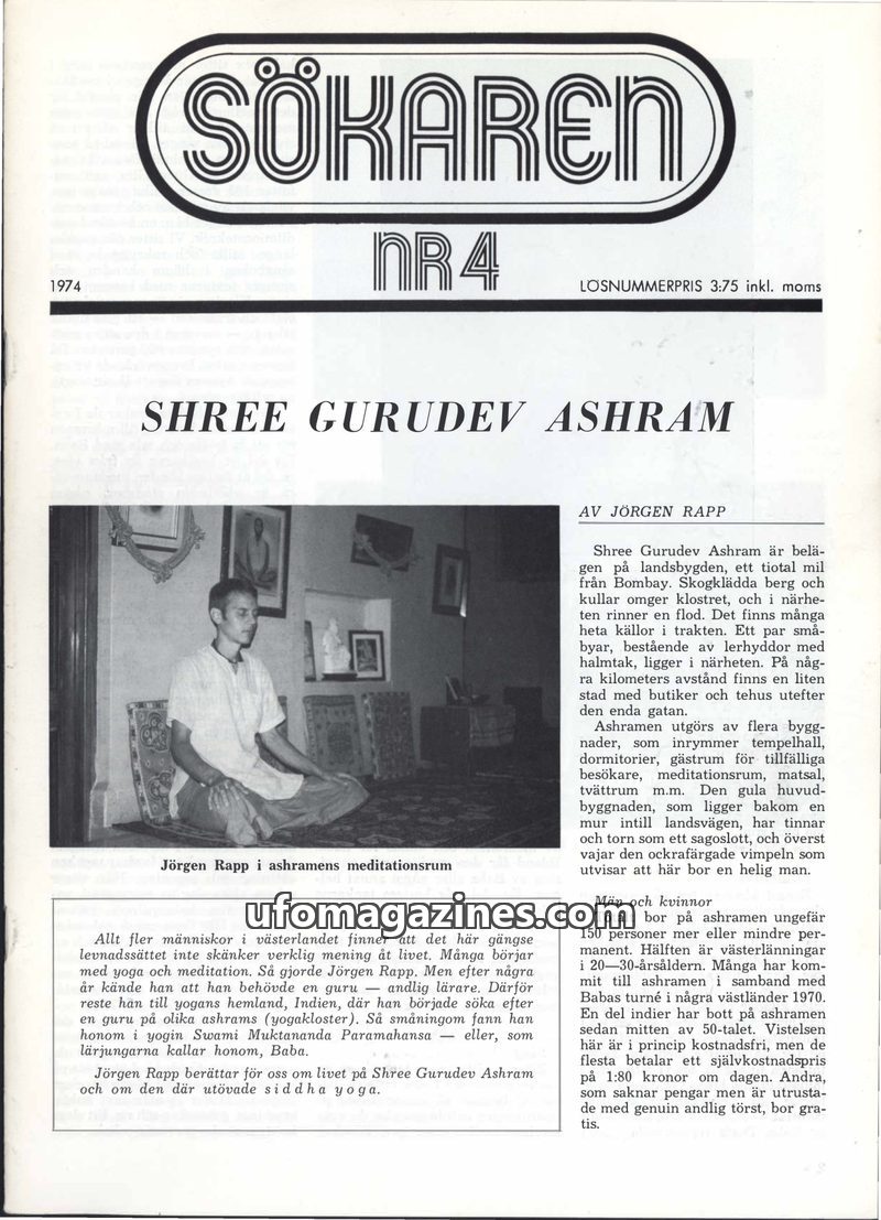 This issue of Sökaren explores various spiritual and parapsychological topics. Jörgen Rapp details life at the Shree Gurudev Ashram in India, focusing on meditation and the teachin
