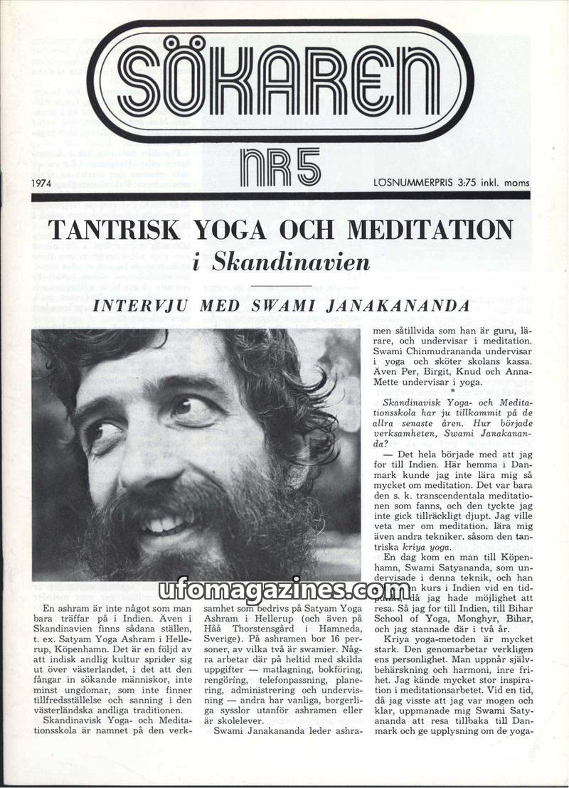 This issue of Sökaren magazine focuses on Tantric Yoga and Meditation in Scandinavia, featuring an interview with Swami Janakananda, who leads Satyam Yoga Ashram. The magazine also
