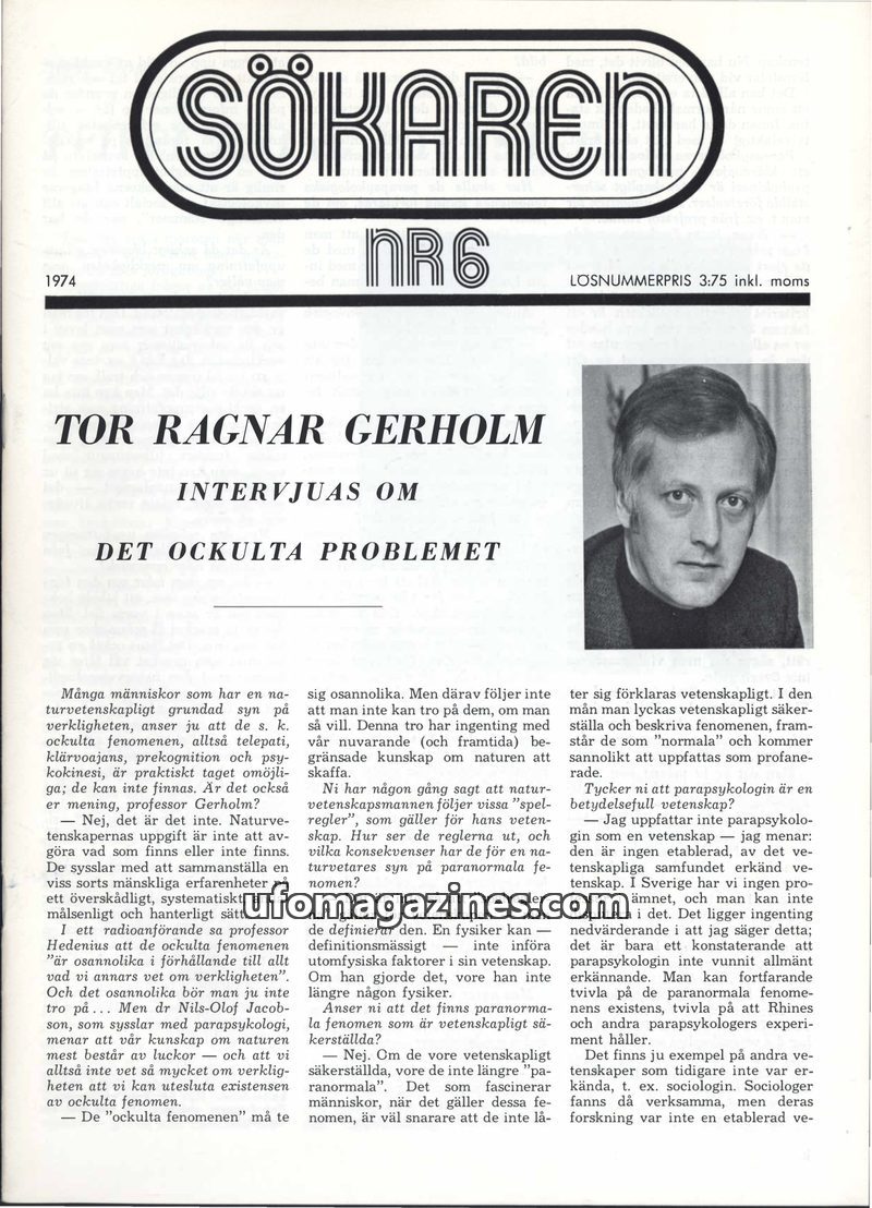 This issue of Sökaren magazine features an interview with Professor Tor Ragnar Gerholm discussing the nature of occult phenomena and the scientific approach to them. It explores th