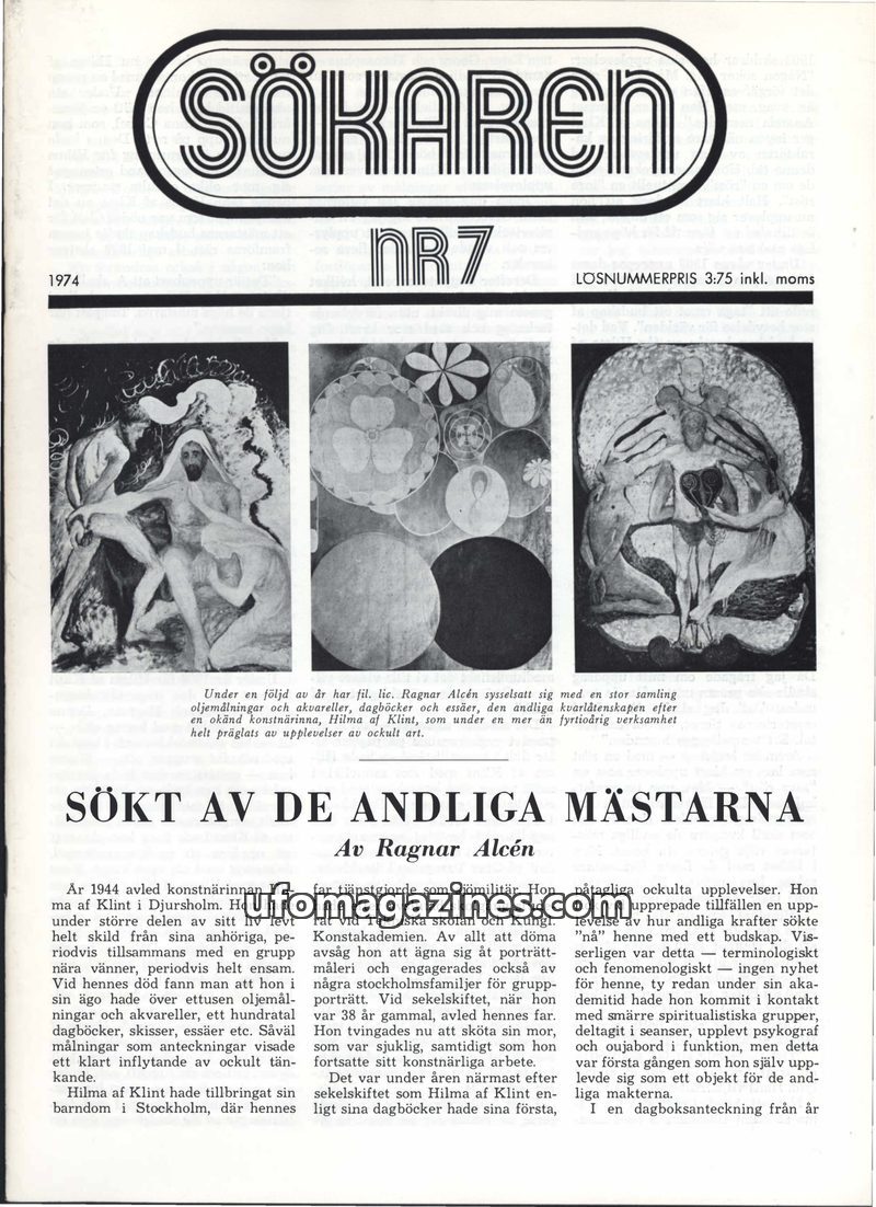 This issue of Sökaren (NR 7, 1974) features an article by Ragnar Alcén titled 'Sought by the Spiritual Masters,' detailing the life and work of artist Hilma af Klint. It explores h