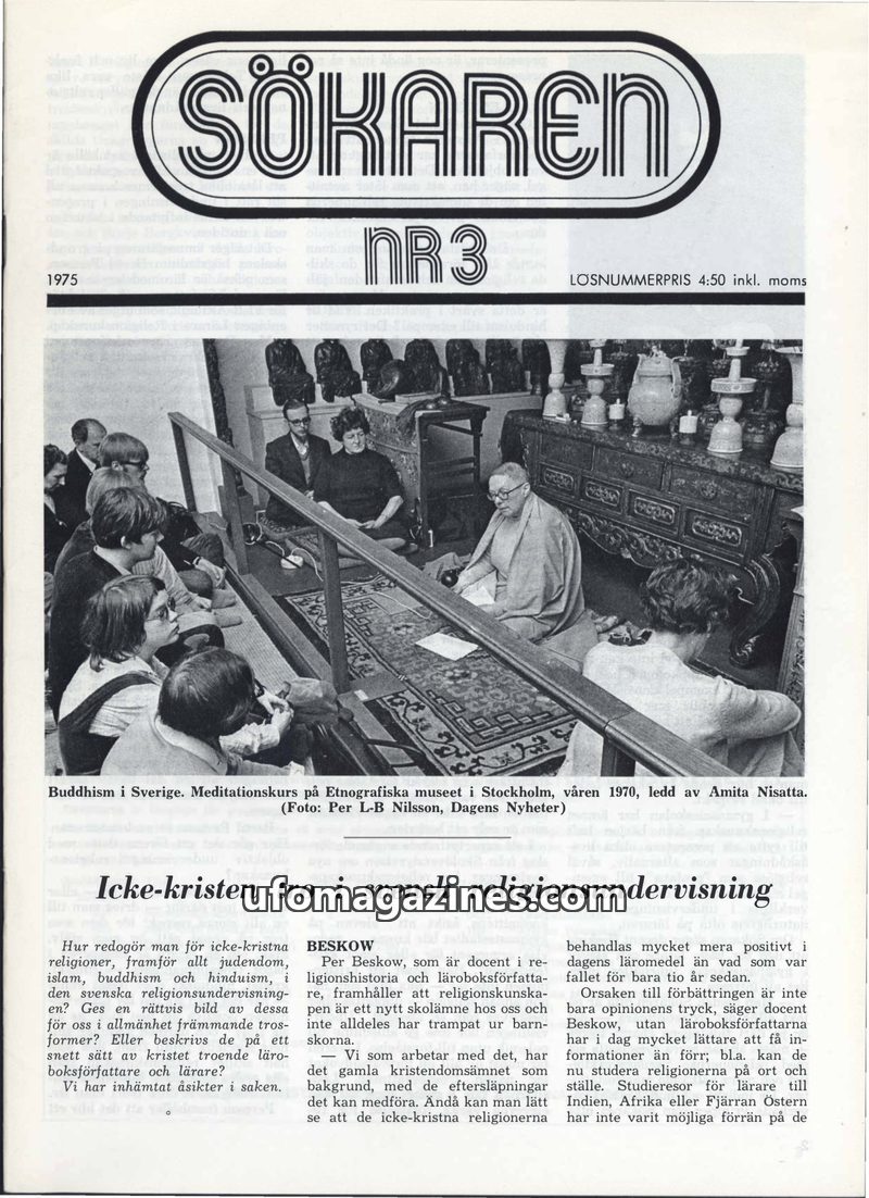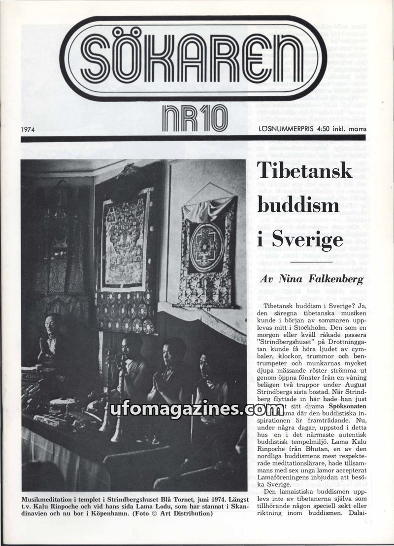 This issue of Sökaren magazine, dated 1974, features an article on Tibetan Buddhism in Sweden, detailing its presence and practices in Stockholm. It highlights the visit of Lama Ka