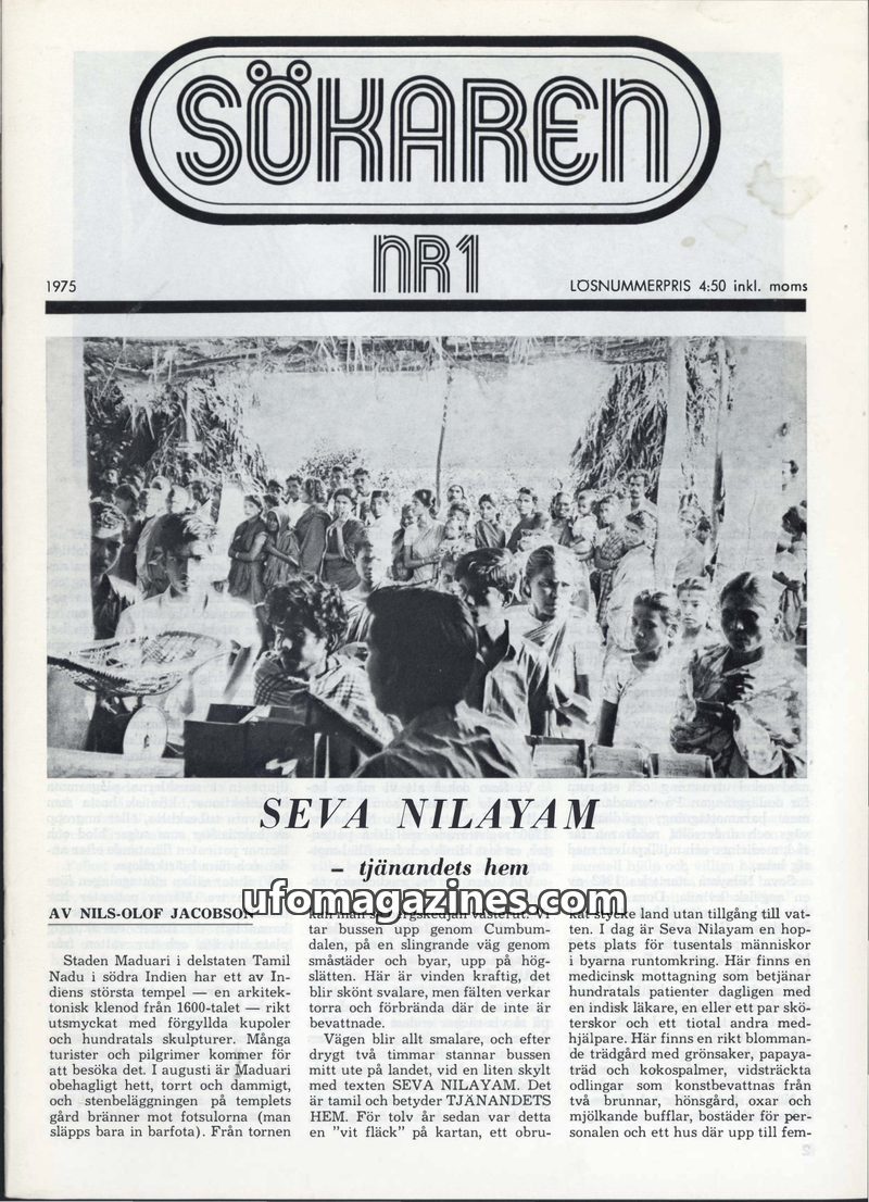 This issue of Sökaren magazine from 1975 covers several significant topics. A major feature details 'Seva Nilayam', a charitable organization in Madurai, India, founded by Dora Sca