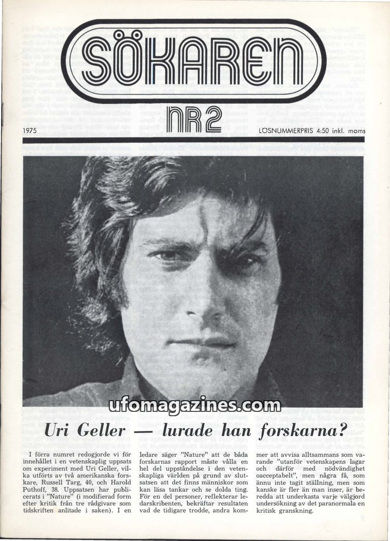 This issue of Sökaren magazine from 1975 delves into various paranormal and fringe topics. A central article questions whether Uri Geller fooled researchers, examining experiments