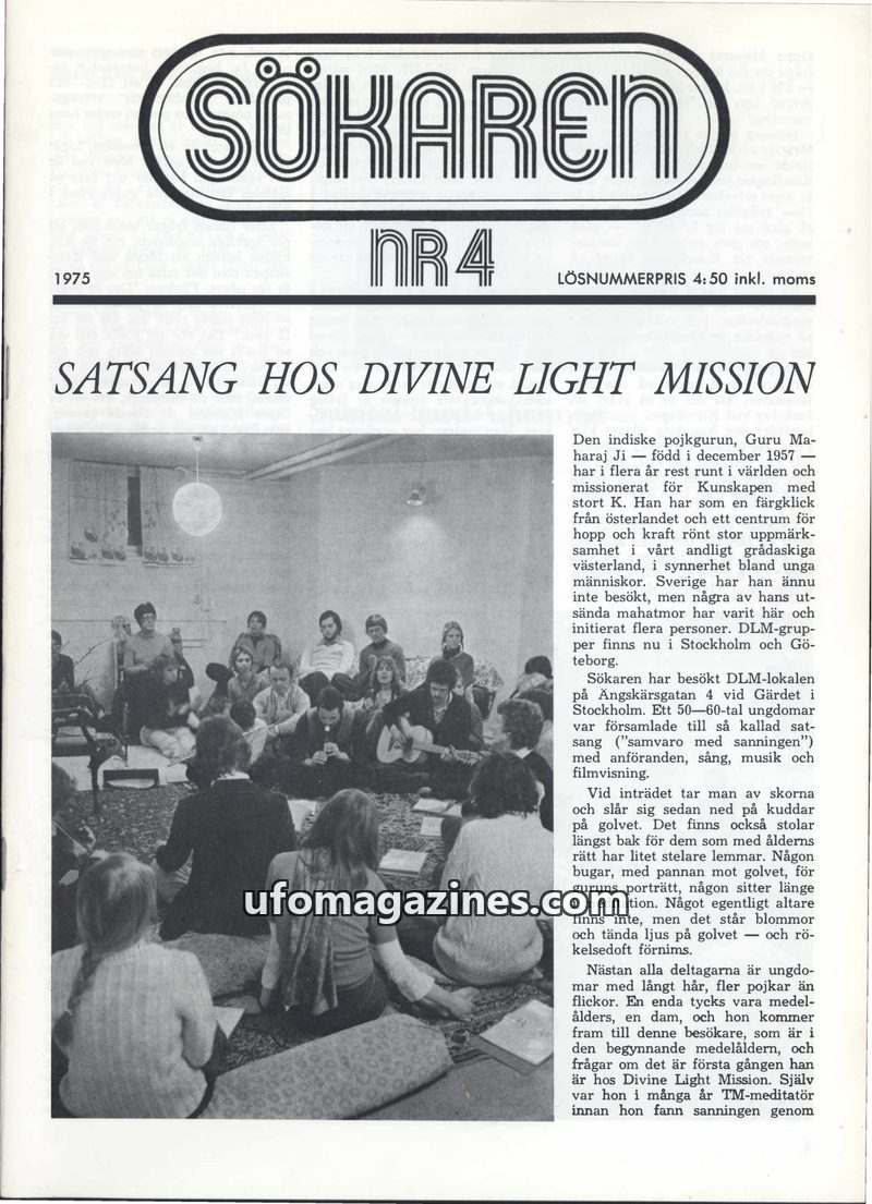 This issue of Sökaren magazine from 1975 delves into the Divine Light Mission, a spiritual movement led by Guru Maharaj Ji, highlighting their satsang gatherings in Stockholm and t