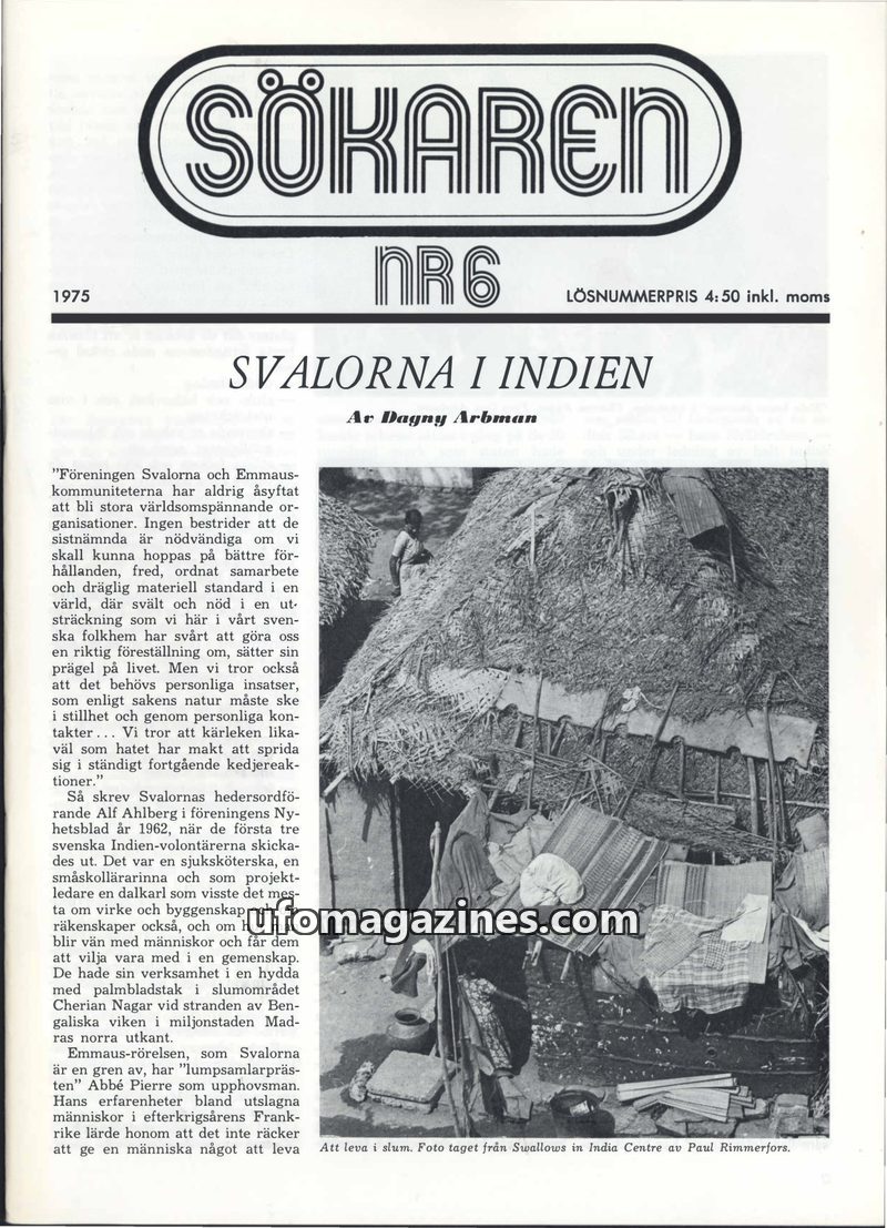 This issue of Sökaren magazine from 1975 covers various topics including the humanitarian work of Svalorna and Emmaus in India, focusing on their efforts in slums and development a