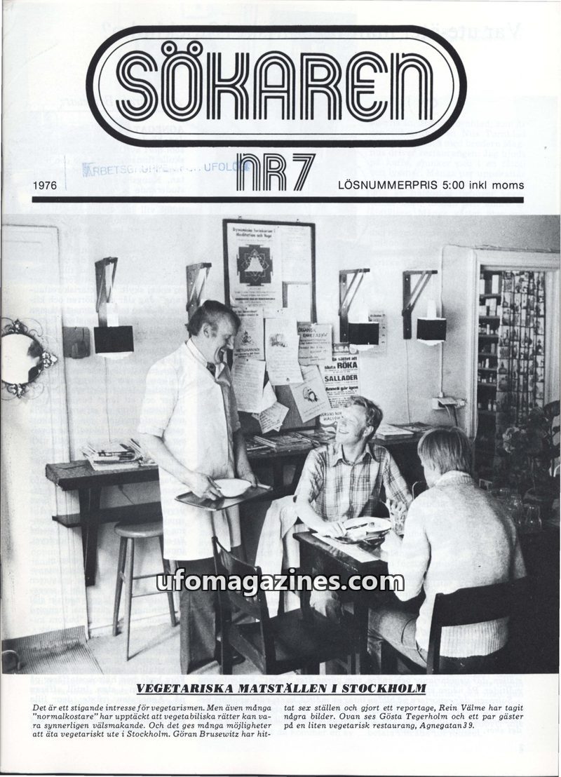 This issue of Sökaren focuses on vegetarianism in Stockholm, featuring reviews of several restaurants. It also delves into spiritual and philosophical topics, including an in-depth