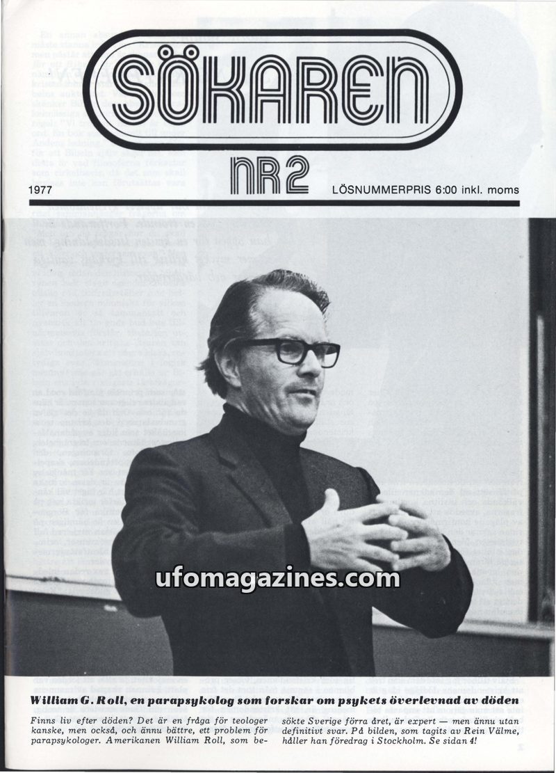 This issue of Sökaren magazine from 1977 delves into parapsychology, with a focus on William G. Roll's research into the survival of consciousness after death. It also features an