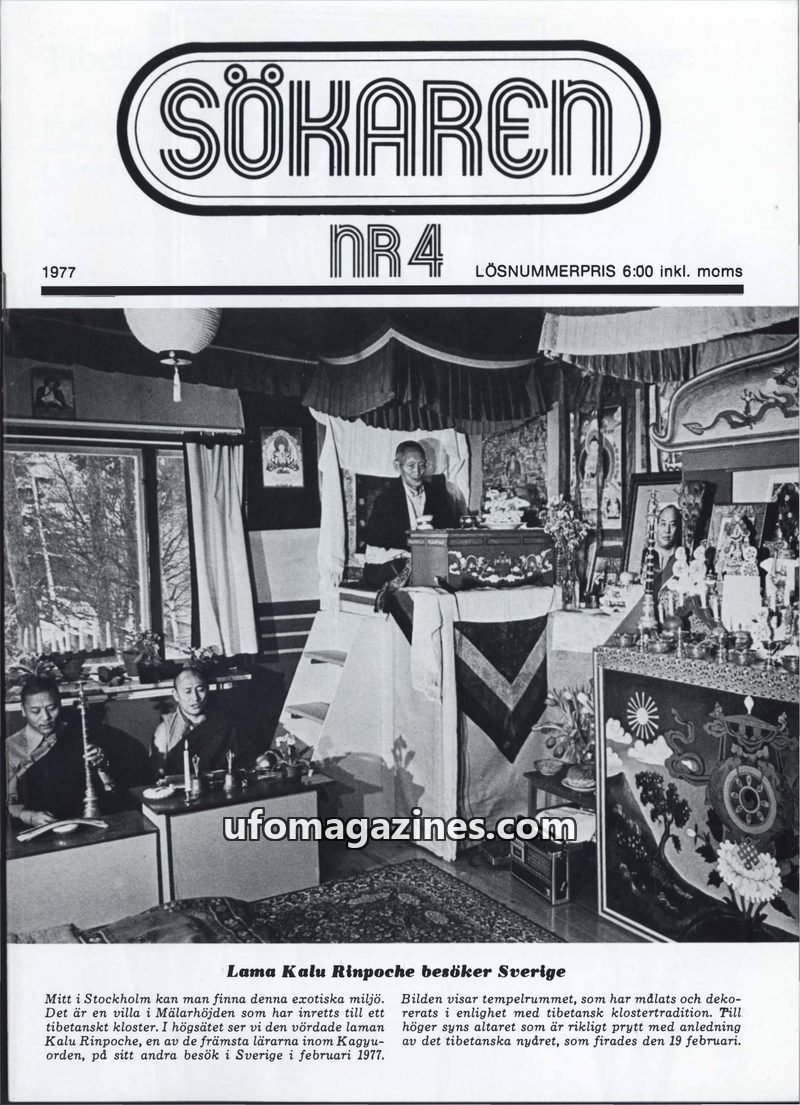 This issue of Sökaren magazine from 1977 focuses on Lama Kalu Rinpoche's visit to Sweden, detailing his teachings on meditation and Tibetan Buddhism. It also delves into a critical