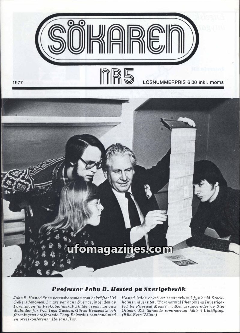 This issue of Sökaren magazine from 1977 focuses on paranormal phenomena, featuring an interview with Professor John B. Hasted, a physicist who confirmed Uri Geller's abilities. Ha