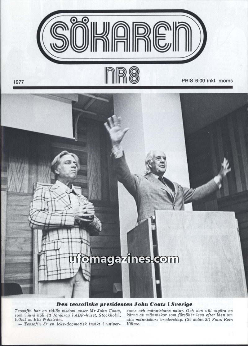 This issue of Sökaren magazine from 1977 explores various spiritual and philosophical topics. It features an interview with John Coats, the world president of the Theosophical Soci