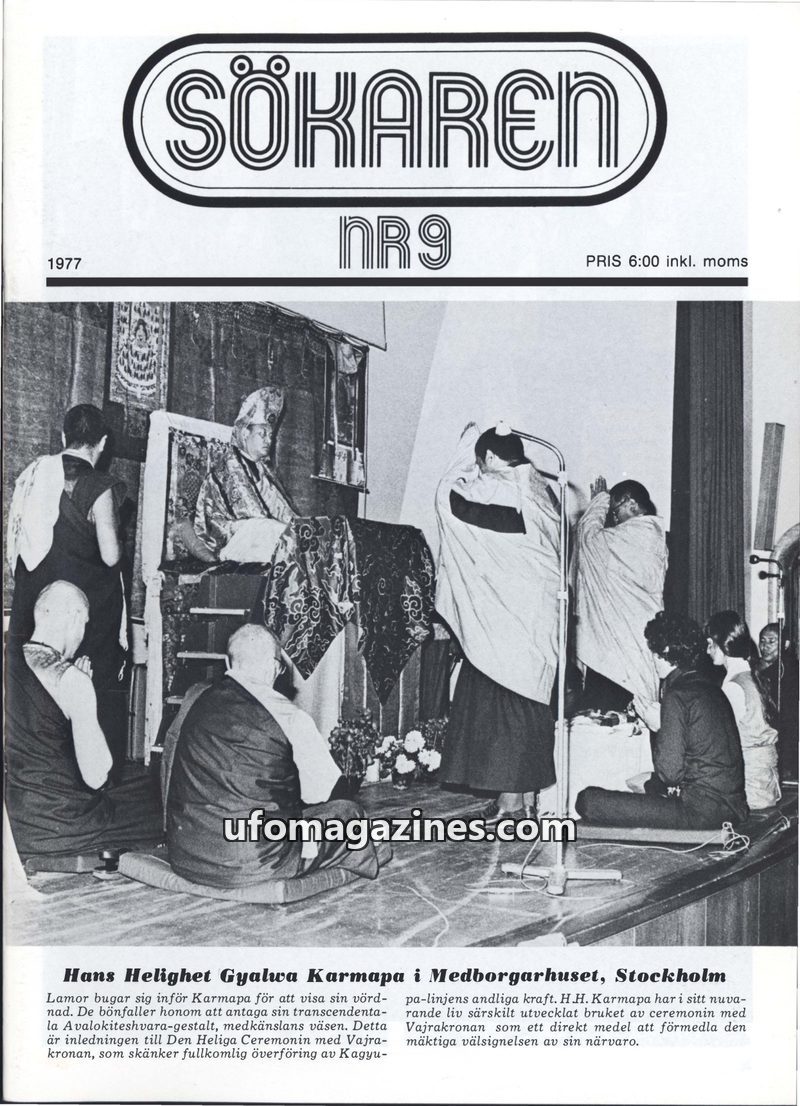 This issue of Sökaren magazine features His Holiness Gyalwa Karmapa's visit to Stockholm, discussing Tibetan Buddhist ceremonies and the Vajrakrona. It delves into Transcendental M
